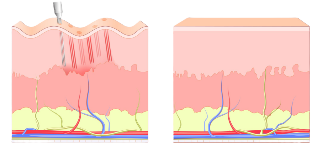 De millioner af små huller der skabes sætter gang i en regeneringsprocess i huden, hvor cellerne bliver mere aktive, og blandt andet danner ny kollagen
